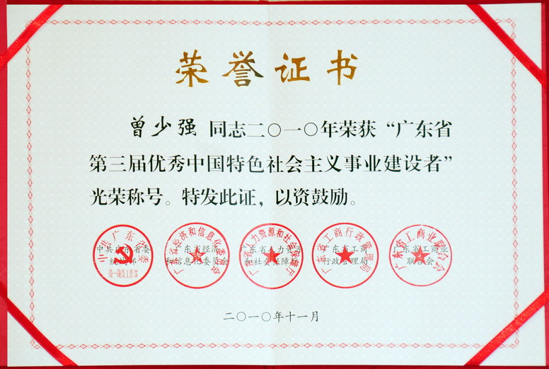 为表彰他们心系国家、情牵人民的爱国情怀,百折不挠、锐意进取的拼搏精神,诚实守信、遵纪守法的优良品格,致富思源、回报社会的贡献意识,进一步促进非公有制经济健康发展和非公有制经济人士等新的社会阶层人士健康成长,决定授予我公司副董事长曾少强先生在内的40名“广东省第三届优秀中国特色社会主义事业建设者”荣誉称号。
